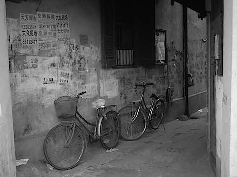 Took a slightly zig-zaggy route from there down to Taikang Lu to the artist quarter – the small, maze like streets of which are always fun to explore. Took the time to spend a relaxed hour or so people watching and drinking green tea. On my way there I saw a man transporting what must have been a wedding flower display on the back of his bike. I’m always struck at how goods are still transported in China – in other parts of the world you get Interflora to deliver flowers in great big air conditioned vans,. It might look like he was effortlessly pedaling along in the photo, but in reality he was pedaling quite hard to get any momentum going.