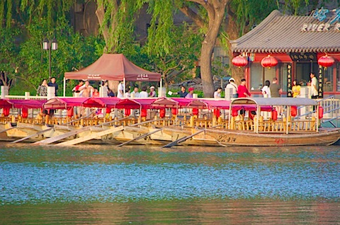 Spent the evening wandering along Qianhai lake, which features, on its banks, many local eateries, a live jazz club and bars. And with the weather in Beijing being gorgeous and warm but not humid, it lent itself beautifully to a nice cold beer outside. Honest, I kid you not, the picture of the lake below is not photoshopped or indeed apertured … it’s au natural … yeah nice, isn’t it? Oh and just in case you didn’t have the time to sit and enjoy a cold beer by the lake: a handy drinking express place … with cold water nicely packaged and heating up in the evening sun … they do think of everything!